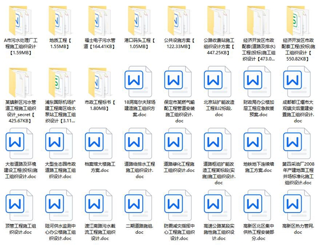摘要:市政工程施组方案含218套市政工程方案,其中含公共设施、污水、园区等市政工程。