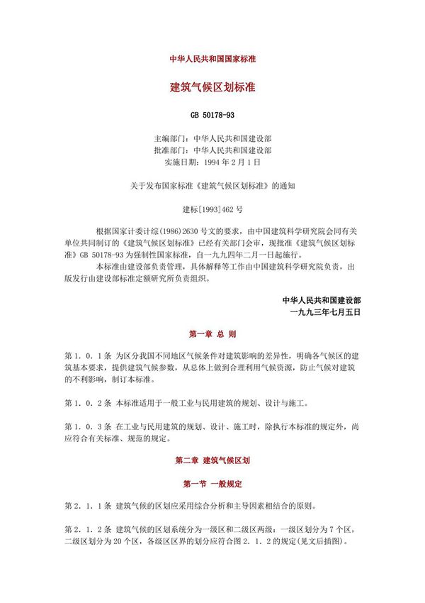 《建筑气候区划标准GB50178-93》是我国建筑行业的重要技术标准,用于指导不同气候条件下建筑物的设计和施工。根据该标准,我国建筑气候区划分为严寒地区、寒冷地区、夏热冬冷地区、夏热冬暖地区和温和地区五大类。每个气候区都有相应的建筑设计要求和节能措施,以确保建筑物在不同气候条件下的适应性、舒适性和能源效率。该标准为建筑行业提供了科学依据,有助于提高建筑质量、降低能耗并促进可持续发展。