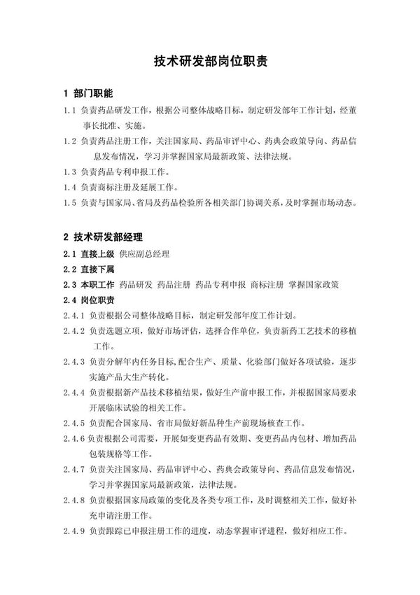 技术研发部岗位职责:1.负责公司产品及技术的研发与创新,推动技术升级和产品迭代。2.根据市场需求和公司战略,制定研发计划并组织实施。3.开展技术预研,评估新技术可行性,确保技术领先性。4.解决研发过程中的技术难题,优化产品性能和质量。5.编写技术文档,规范研发流程,确保研发工作有序进行。6.与其他部门协作,提供技术支持,推动产品落地和市场推广。7.跟踪行业技术动态,参与技术交流,提升团队技术水平。8.负责研发团队的建设与管理,培养技术人才,提升团队整体能力。新增描述:9.建立和完善研发质量管理体系,确保研发过程符合相关标准和规范,降低技术风险,提高研发效率和成果可靠性。