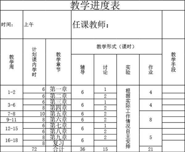 教学进度表模板是一种用于规划和管理课程教学进度的工具,主要用于帮助教师合理安排教学内容、明确教学目标并确保教学任务按时完成。该模板通常包含课程名称、授课时间、章节或单元划分、教学内容、教学目标、教学方法、作业或考核安排等关键要素。通过使用教学进度表,教师可以系统性地跟踪教学进度,确保课程按计划推进,同时也有助于学生了解课程安排和学习重点。该模板适用于各级各类学校和教育机构,可根据具体课程需求进行调整和优化。