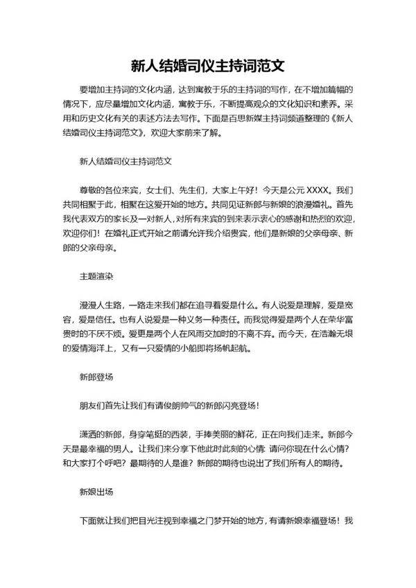 新人结婚司仪主持词是婚礼上不可或缺的重要环节,它不仅能营造温馨浪漫的氛围,还能引导婚礼流程顺利进行。一段好的主持词应当包含开场白、新人介绍、爱情故事分享、亲友祝福、婚礼仪式引导以及结束语等部分。主持词的语言要温馨得体,既要庄重又不失幽默,既要简洁明了又能打动人心。下面是一段经典的婚礼司仪主持词范文,供参考使用。