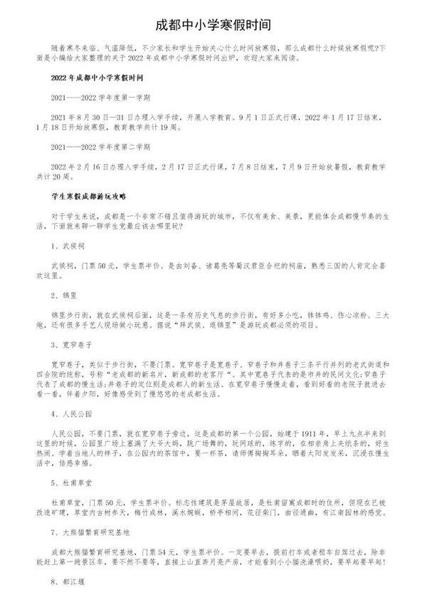 成都市中小学寒假时间通常安排在每年的1月下旬至2月中旬,具体日期由成都市教育局根据当年教学安排和节假日调休情况统一发布。寒假时长一般为3-4周,不同学段可能存在细微差异。建议家长和学生关注当年教育局或学校的正式通知,以便及时了解准确的放假和开学时间安排。寒假期间学生可合理安排学习与休息,注意假期安全。