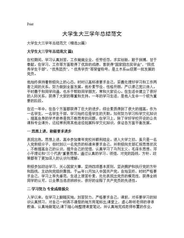 大学生大三学年总结是对过去一年学习、生活和成长经历的回顾与反思。它通常包括学业成绩、实践活动、个人能力提升、遇到的挑战及解决方案等方面的内容。通过总结,学生可以梳理自己的收获与不足,明确未来发展方向,为即将到来的大四学年和毕业后的规划做好准备。范文可以为你提供写作思路和参考框架,帮助你更好地完成自己的学年总结。