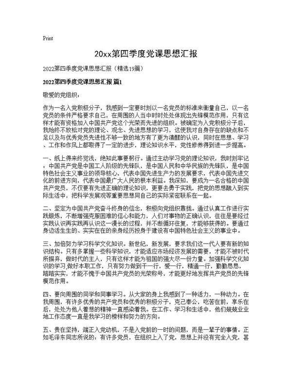 2026年第四季度党课思想汇报简介尊敬的党组织:在2026年第四季度,我认真参加了党组织安排的党课学习,深入学习了党的最新理论成果和方针政策。通过这一阶段的学习,我对习近平新时代中国特色社会主义思想有了更深刻的理解,进一步坚定了理想信念,增强了党性修养。在工作和生活中,我始终以党员标准严格要求自己,努力发挥先锋模范作用。现将本季度的思想、学习和工作情况向党组织汇报,请予以审查和指导。汇报人:XXX2026年XX月XX日