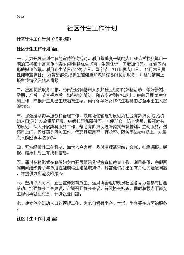 社区计生工作计划8篇 利用计生节日(529协会日、母亲节、711世界人口日、 10月28日男性健康宣传日),为育龄群众提供生殖健康知识和信息的优质服务,并及时准确上报宣传情况及信息简报。二、提高优质服务工作。动员社区育龄妇女参加社区组织的妇检活动,做好新婚、孕期、产后、节育手术后、妇科病的随访,随访率达到95%以上。继续开展优生检测工作,降低新生儿出生缺陷发生率,确保怀孕妇女作优生检测的占当年出生人数的35%。三、加强避孕药具服务和管理工作。以属地化管理为原则为社区育龄妇女(包括流动人口)及时发放