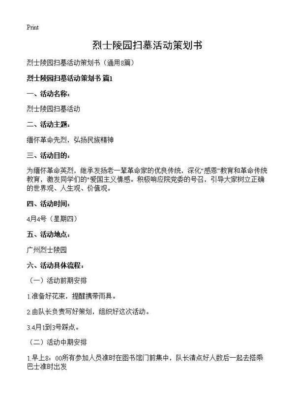 烈士陵园扫墓活动策划书8篇 4月4号(星期四)广州烈士陵园(一)活动前期安排1.准备好花束,提醒携带雨具。2.由队长负责写好策划,组织好这次活动。3.4月1到3号踩点。(二)活动中期安排1.早上8:00所有参加人员准时在图书馆门前集中,队长清点好人数后一起去搭乘巴士准时出发2.早上9:00到达烈士陵园后按秩序进场3.9:20宣誓人带领队员宣誓4.全体默哀3分钟5.9:35默哀完毕后,献花6.9:50献花完毕,大家可以自由在烈士陵园参观学习7.11:00大家准时在陵园门口集中,队长点好人数后带队返校(三)