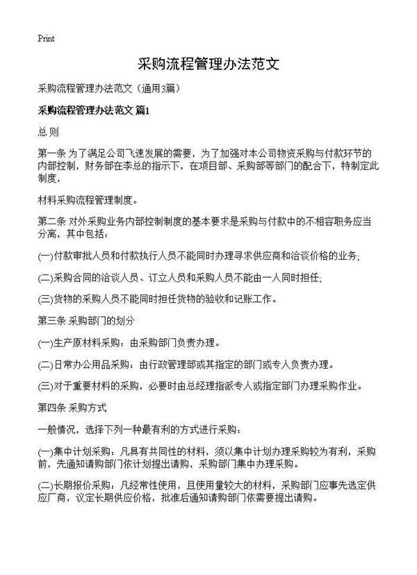 采购流程管理办法范文3篇 第三条 采购部门的划分(一)生产原材料采购:由采购部门负责办理。(二)日常办公用品采购:由行政管理部或其指定的部门或专人负责办理。(三)对于重要材料的采购,必要时由总经理指派专人或指定部门办理采购作业。第四条 采购方式一般情况,选择下列一种最有利的方式进行采购:(一)集中计划采购:凡具有共同性的材料,须以集中计划办理采购较为有利,采购前,先通知请购部门依计划提出请购,采购部门集中办理采购。(二)长期报价采购:凡经常性使用,且使用量较大的材料,采购部门应事先选定供应厂商,议定长