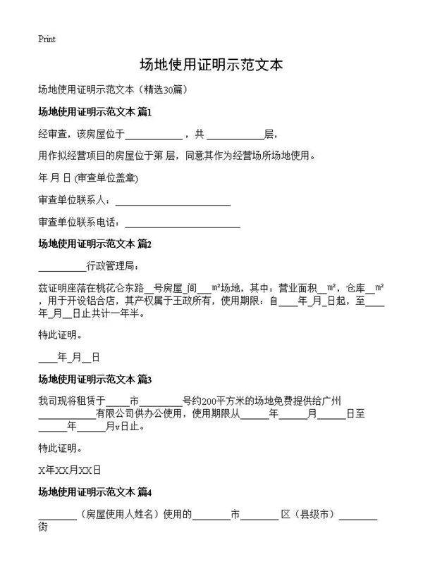 场地使用证明示范文本30篇 特此证明。____年_月__日我司现将租赁于_____市_________号约200平方米的场地免费提供给广州____________有限公司供办公使用,使用期限从______年______月______日至______年______月v日止。特此证明。X年XX月XX日________(房屋使用人姓名)使用的________市________ 区(县级市)________街(村)________(房屋地址)房屋,可临时作为生产(经营)性场所使用。经营者在使用时应注意以下事项: