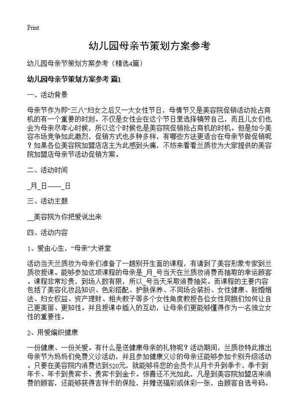 幼儿园母亲节策划方案参考4篇 但是如今美容市场竞争如此激烈,促销方式也多种多样,有哪些方法更适合在母亲节做促销呢?如果各位美容院加盟店店主为此感到头痛,不妨来看看兰质妆为大家提供的美容院加盟店母亲节活动促销方案。二、活动时间_月_日——_日三、活动主题__美容院为你把爱说出来四、活动内容1、爱由心生,“母亲”大讲堂活动当天兰质妆为母亲们准备了一趟别开生面的课程,有请到了美容形象专家到兰质妆授课。能够参加这项课程的母亲是_月_号当天在兰质妆消费而抽取的幸运顾客。课程非常珍贵,到场人数有限,所以_号当天采取消