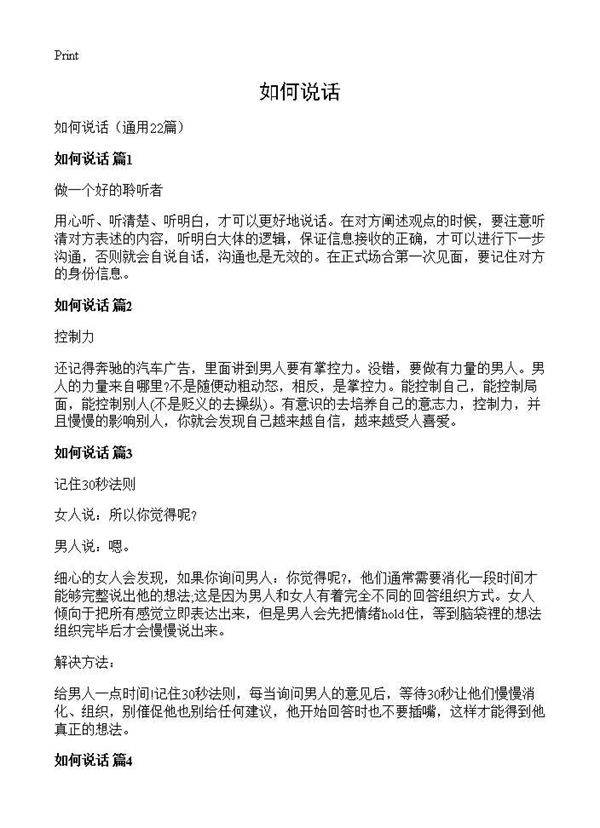 如何说话22篇 在正式场合第一次见面,要记住对方的身份信息。控制力还记得奔驰的汽车广告,里面讲到男人要有掌控力。没错,要做有力量的男人。男人的力量来自哪里?不是随便动粗动怒,相反,是掌控力。能控制自己,能控制局面,能控制别人(不是贬义的去操纵)。有意识的去培养自己的意志力,控制力,并且慢慢的影响别人,你就会发现自己越来越自信,越来越受人喜爱。记住30秒法则女人说:所以你觉得呢?男人说:嗯。细心的女人会发现,如果你询问男人:你觉得呢?,他们通常需要消化一段时间才能够完整说出他的想法;这是因为男