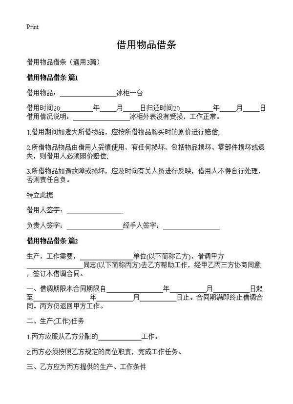 借用物品借条3篇 特立此据借用人签字:_________________负责人签字:_________________经手人签字:_________________生产,工作需要,________________单位(以下简称乙方),借调甲方_________________同志(以下简称丙方)去乙方帮助工作,经甲乙丙三方协商同意,签订本借调合同。一、借调期限本合同期限自_________________年___________月___________日起至_________________年
