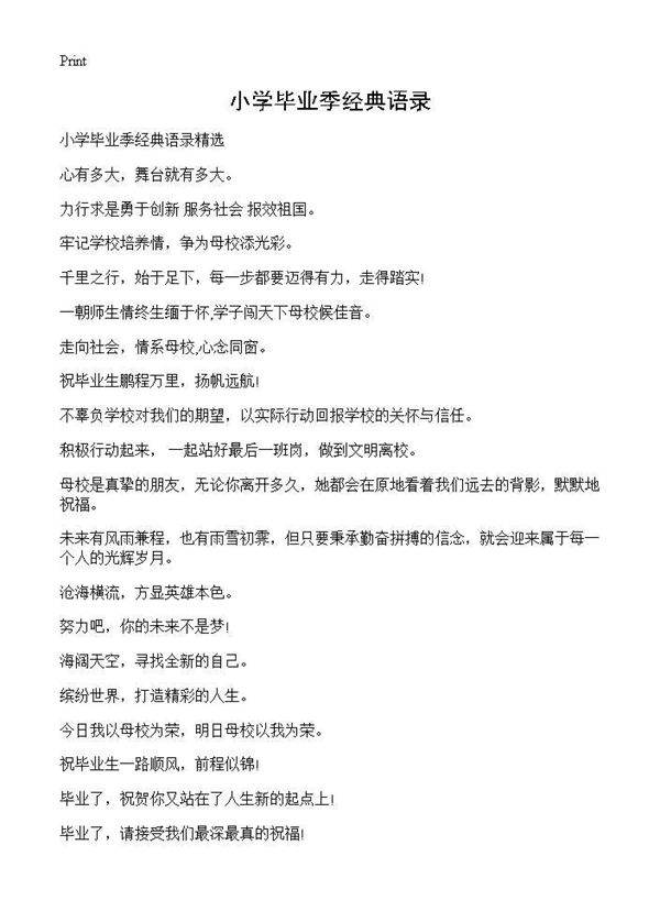 小学毕业季经典语录 牢记学校培养情,争为母校添光彩。千里之行,始于足下,每一步都要迈得有力,走得踏实!一朝师生情终生缅于怀,学子闯天下母校候佳音。走向社会,情系母校,心念同窗。祝毕业生鹏程万里,扬帆远航!不辜负学校对我们的期望,以实际行动回报学校的关怀与信任。积极行动起来, 一起站好最后一班岗,做到文明离校。母校是真挚的朋友,无论你离开多久,她都会在原地看着我们远去的背影,默默地祝福。未来有风雨兼程,也有雨雪初霁,但只要秉承勤奋拼搏的信念,就会迎来属于每一个人的光辉岁月。沧海横流,方显英雄本色。