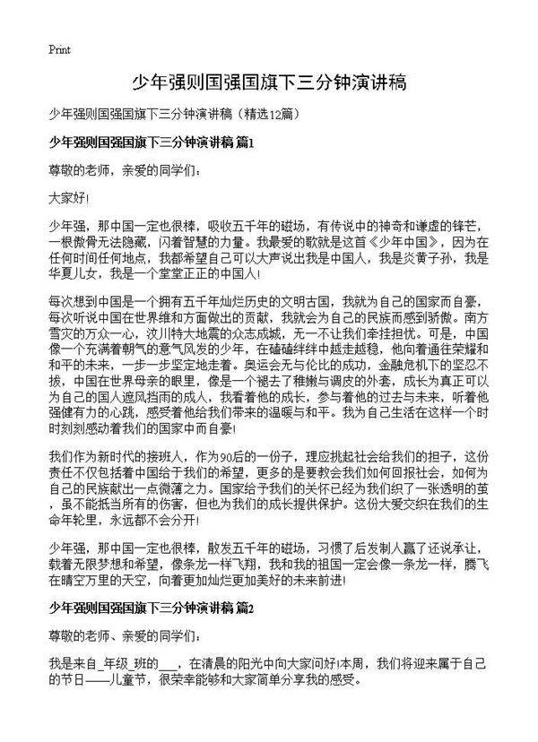 少年强则国强国旗下三分钟演讲稿12篇 南方雪灾的万众一心,汶川特大地震的众志成城,无一不让我们牵挂担忧。可是,中国像一个充满着朝气的意气风发的少年,在磕磕绊绊中越走越稳,他向着通往荣耀和和平的未来,一步一步坚定地走着。奥运会无与伦比的成功,金融危机下的坚忍不拔,中国在世界母亲的眼里,像是一个褪去了稚嫩与调皮的外套,成长为真正可以为自己的国人遮风挡雨的成人,我看着他的成长,参与着他的过去与未来,听着他强健有力的心跳,感受着他给我们带来的温暖与和平。我为自己生活在这样一个时时刻刻感动着我们的国家中而自豪!我们作为新时