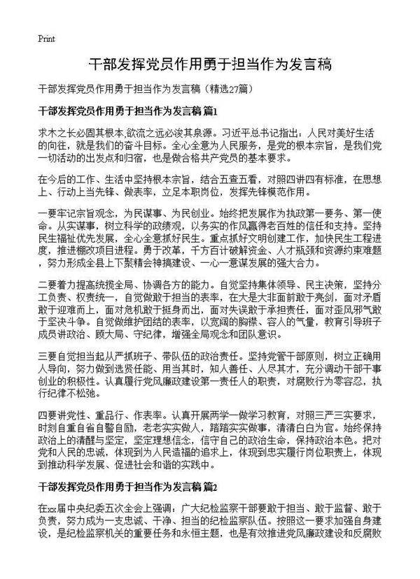 干部发挥党员作用勇于担当作为发言稿27篇 全心全意为人民服务,是党的根本宗旨,是我们党一切活动的出发点和归宿,也是做合格共产党员的基本要求。在今后的工作、生活中坚持根本宗旨,结合五查五看,对照四讲四有标准,在思想上、行动上当先锋、做表率,立足本职岗位,发挥先锋模范作用。一要牢记宗旨观念,为民谋事、为民创业。始终把发展作为执政第一要务、第一使命。从实谋事,树立科学的政绩观,以务实的作风赢得老百姓的信任和支持。坚持民生福祉优先发展,全心全意抓好民生。重点抓好文明创建工作,加快民生工程进度,推进棚改项目进程。勇于改革,千方