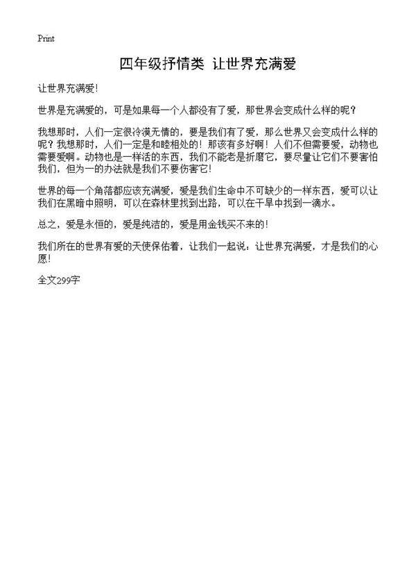 四年级抒情类 让世界充满爱 总之,爱是永恒的,爱是纯洁的,爱是用金钱买不来的!我们所在的世界有爱的天使保佑着,让我们一起说:让世界充满爱,才是我们的心愿!