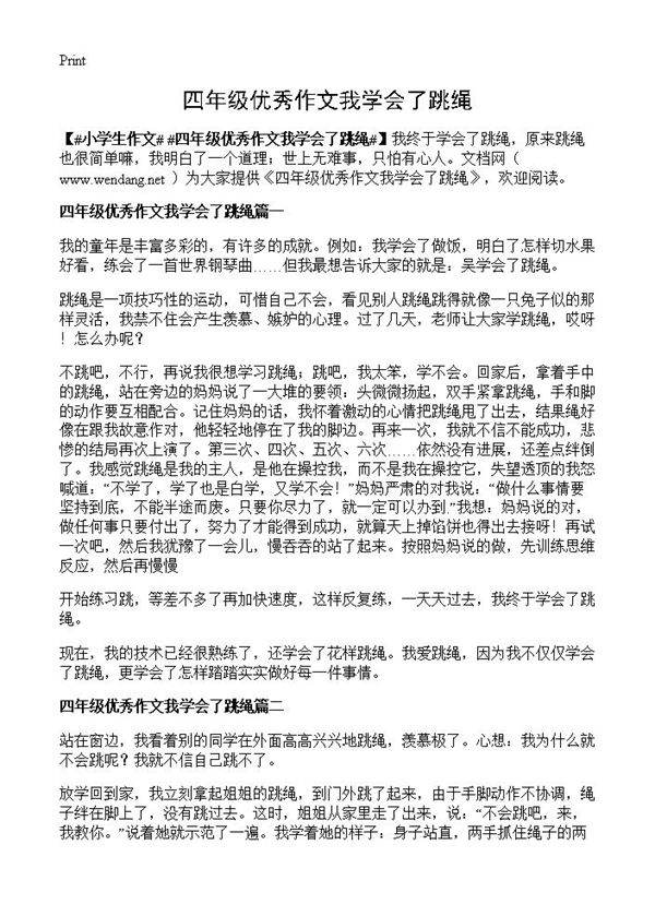 四年级优秀作文我学会了跳绳 跳绳是一项技巧性的运动,可惜自己不会,看见别人跳绳跳得就像一只兔子似的那样灵活,我禁不住会产生羡慕、嫉妒的心理。过了几天,老师让大家学跳绳,哎呀!怎么办呢?不跳吧,不行,再说我很想学习跳绳;跳吧,我太笨,学不会。回家后,拿着手中的跳绳,站在旁边的妈妈说了一大堆的要领:头微微扬起,双手紧拿跳绳,手和脚的动作要互相配合。记住妈妈的话,我怀着激动的心情把跳绳甩了出去,结果绳好像在跟我故意作对,他轻轻地停在了我的脚边。再来一次,我就不信不能成功,悲惨的结局再次上演了。第三次、四次、五