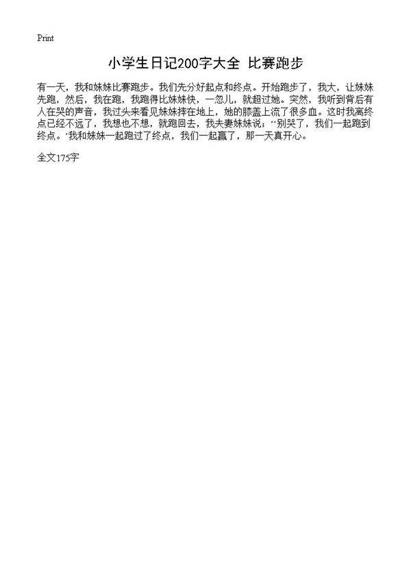 小学生日记200字大全 比赛跑步 开始跑步了,我大,让妹妹先跑,然后,我在跑,我跑得比妹妹快,一忽儿,就超过她。突然,我听到背后有人在哭的声音,我过头来看见妹妹摔在地上,她的膝盖上流了很多血。这时我离终点已经不远了,我想也不想,就跑回去,我夫妻妹妹说;‘‘别哭了,我们一起跑到终点。’我和妹妹一起跑过了终点,我们一起赢了,那一天真开心。