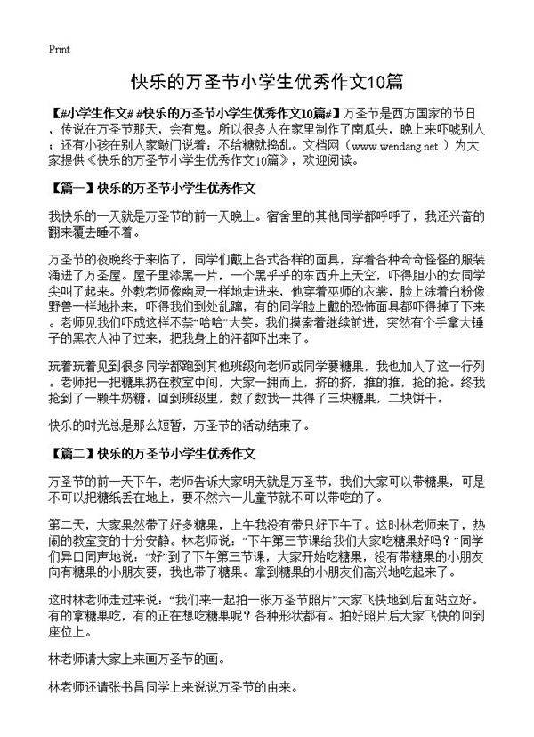 快乐的万圣节小学生优秀作文10篇 万圣节的夜晚终于来临了,同学们戴上各式各样的面具,穿着各种奇奇怪怪的服装涌进了万圣屋。屋子里漆黑一片,一个黑乎乎的东西升上天空,吓得胆小的女同学尖叫了起来。外教老师像幽灵一样地走进来,他穿着巫师的衣裳,脸上涂着白粉像野兽一样地扑来,吓得我们到处乱蹿,有的同学脸上戴的恐怖面具都吓得掉了下来。老师见我们吓成这样不禁“哈哈”大笑。我们摸索着继续前进,突然有个手拿大锤子的黑衣人冲了过来,把我身上的汗都吓出来了。玩着玩着见到很多同学都跑到其他班级向老师或同学要糖果,我也加入了这一行列。