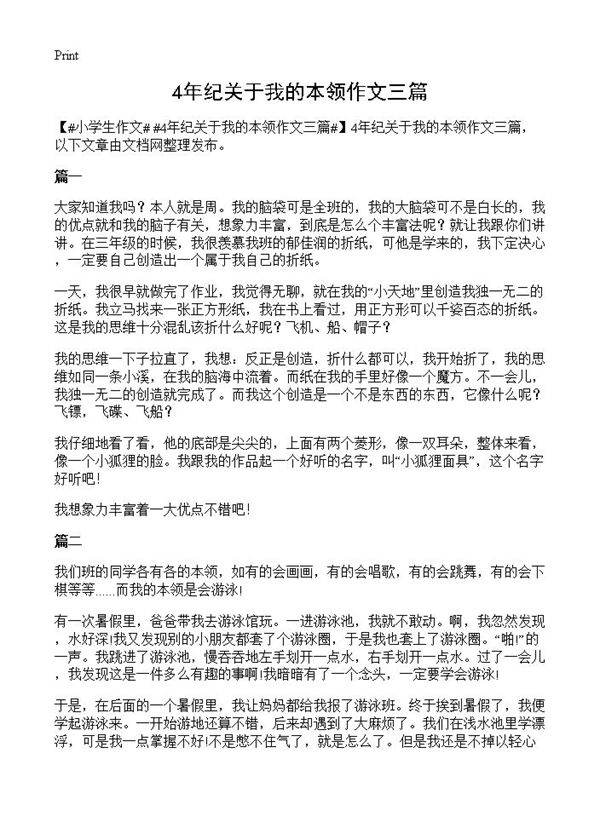 4年纪关于我的本领作文三篇 我的脑袋可是全班的,我的大脑袋可不是白长的,我的优点就和我的脑子有关,想象力丰富,到底是怎么个丰富法呢?就让我跟你们讲讲。在三年级的时候,我很羡慕我班的郁佳润的折纸,可他是学来的,我下定决心,一定要自己创造出一个属于我自己的折纸。一天,我很早就做完了作业,我觉得无聊,就在我的“小天地”里创造我独一无二的折纸。我立马找来一张正方形纸,我在书上看过,用正方形可以千姿百态的折纸。这是我的思维十分混乱该折什么好呢?飞机、船、帽子?我的思维一下子拉直了,我想:反正是创造,折什么都可以,