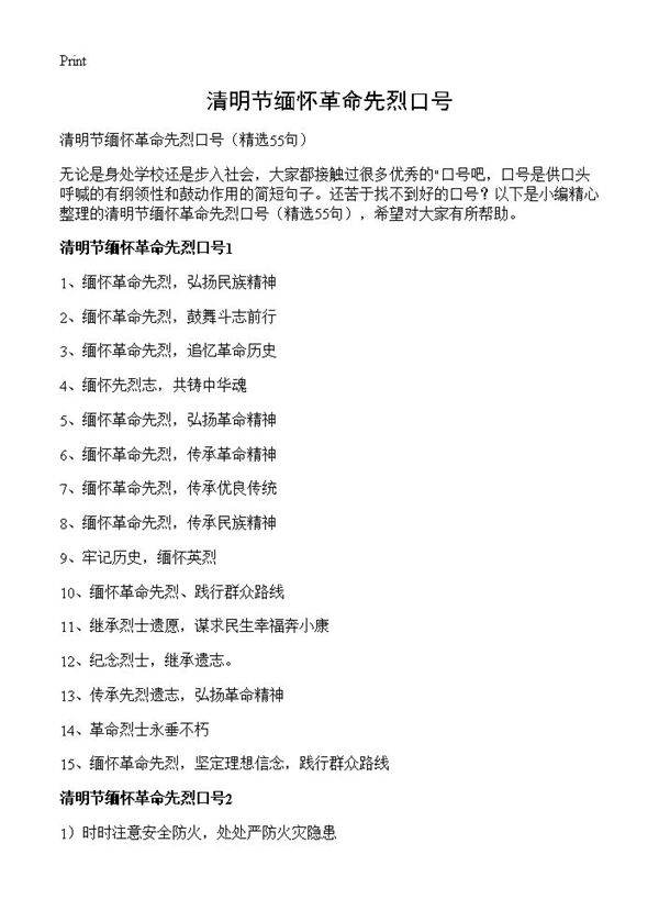 清明节是中华民族缅怀先人、寄托哀思的传统节日,也是我们追思革命先烈、弘扬爱国主义精神的重要时刻。革命先烈们用鲜血和生命换来了今天的和平与幸福,他们的英勇事迹和崇高精神永远值得我们铭记与传承。在这个特殊的日子里,让我们以口号的形式表达对革命先烈的深切缅怀和崇高敬意,激励后人继承先烈遗志,发扬革命传统,为实现中华民族伟大复兴的中国梦而不懈奋斗。