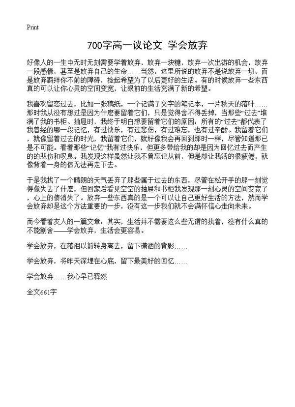 700字高一议论文 学会放弃 我喜欢留恋过去,比如一张稿纸,一个记满了文字的笔记本,一片秋天的落叶……那时我从没有想过是因为什麽要留着它们,只是觉得舍不得丢掉,当那些“过去”堆满了我的书柜、抽屉时,我终于明白想要留着它们的原因:所有的“过去”都代表了我曾经的哪一段记忆,有过快乐,有过悲伤,有过难忘,也有过辛酸。我留着它们,就像留着过去的时光,我留着它们,就好像我会再回到那时一样,尽管知道那已是不可能。看着那些“记忆”我有过快乐,但更多带给我的却是因为回忆过去而产生的的悲伤和叹息。我发现这样虽然让我不曾忘记
