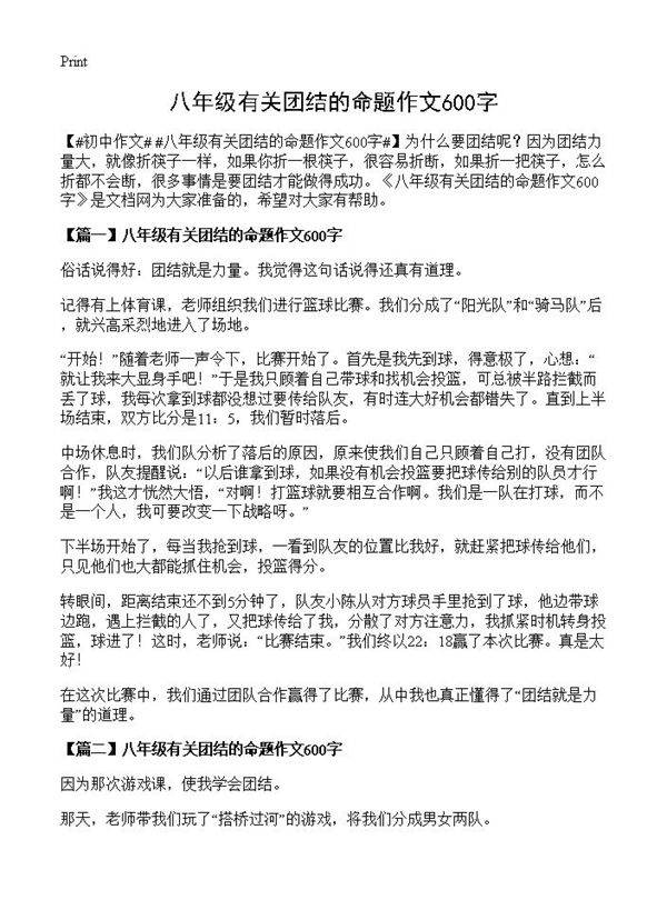 八年级有关团结的命题作文600字 俗话说得好:团结就是力量。我觉得这句话说得还真有道理。记得有上体育课,老师组织我们进行篮球比赛。我们分成了“阳光队”和“骑马队”后,就兴高采烈地进入了场地。“开始!”随着老师一声令下,比赛开始了。首先是我先到球,得意极了,心想:“就让我来大显身手吧!”于是我只顾着自己带球和找机会投篮,可总被半路拦截而丢了球,我每次拿到球都没想过要传给队友,有时连大好机会都错失了。直到上半场结束,双方比分是11:5,我们暂时落后。中场休息时,我们队分析了落后的原因,原来使我们自己只顾着自己打,