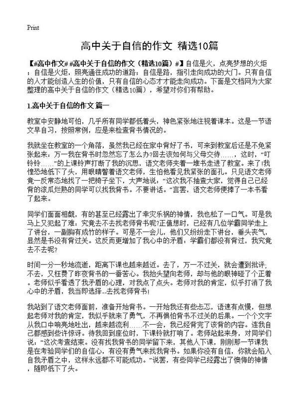 高中关于自信的作文10篇 我就坐在教室的一个角落,虽然我已经在家中背好了书,可来到教室后还是不免紧张起来:万一我在背书时忽然忘了怎么办?回去该如何与父母交待……,这时,“叮铃铃……”的上课铃声打断了我的沉思,语文老师夹着一堆书走进了教室。来了!我惶恐地低下了头,用眼睛瞥着语文老师,生怕他看见我紧张的面孔。只见语文老师竟一反常态地找了一把椅子坐下,大声地说:“这次我不抽查大家,觉得自己已经背的滚瓜烂熟的同学可以找我背书。不要讲话。”言罢,语文老师便捧了一本书看了起来。同学们面面相觑,有的甚至已经露出了幸