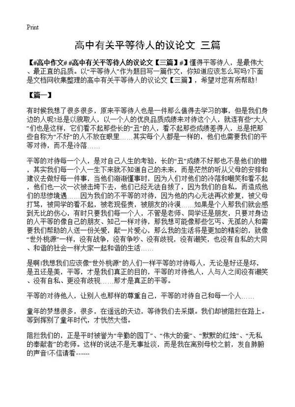 高中有关平等待人的议论文 我们却被阻拦在路上。等到挥别了童年时代,才恍然大悟。阻拦我们的,正是平时被誉为“辛勤的园丁”、“伟大的蚕”、“默默的红烛”、“无私的奉献者”的老师。这样的说法不是无事扯淡,而是我在离别母校之前,发自肺腑的声音!不信请看------第一幕:“笨蛋!又不及格!”老师在怒吼,大地仿佛都在颤抖;我们听得心惊肉跳,不禁有了惊肉跳,不禁有了后悔来上学的想法。听,“我告诉你,等我当上了教授,你就能及格。”我听了这样的话,心好酸,差生也是有血有肉有感情的人啊,老师怎么能因为他们成绩不好而责备