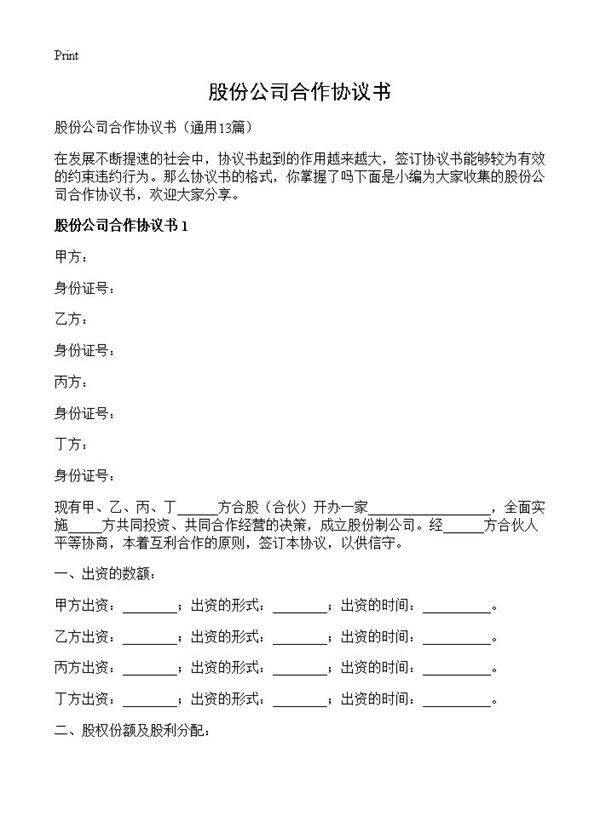 股份公司合作协议书13篇 甲方:身份证号:乙方:身份证号:丙方:身份证号:丁方:身份证号:现有甲、乙、丙、丁______方合股(合伙)开办一家__________________,全面实施_____方共同投资、共同合作经营的决策,成立股份制公司。经______方合伙人平等协商,本着互利合作的原则,签订本协议,以供信守。一、出资的数额:甲方出资:________;出资的形式:________;出资的时间:__________。乙方出资:________;出资的形式:________;出资的时间:____
