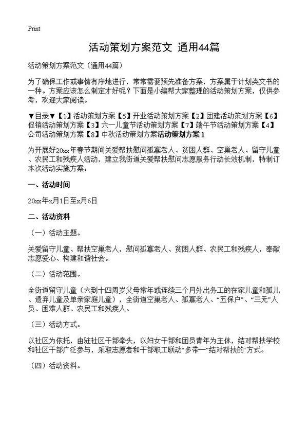 活动策划方案范文44篇 ▼目录▼【1】活动策划方案【5】开业活动策划方案【2】团建活动策划方案【6】促销活动策划方案【3】六一儿童节活动策划方案【7】端午节活动策划方案【4】公司活动策划方案【8】中秋活动策划方案活动策划方案 1为开展好20xx年春节期间关爱帮扶慰问孤寡老人、贫困人群、空巢老人、留守儿童、农民工和残疾人活动,建立我街道关爱帮扶慰问志愿服务行动长效机制,特制订本次活动实施方案:20xx年x月1日至x月6日(一)活动主题。关爱留守儿童、帮扶空巢老人,慰问孤寡老人、贫困人群、农民工和残疾人