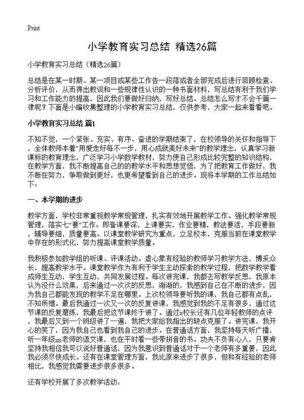 小学教育实习总结26篇 不知不觉,一个紧张、充实、有序、奋进的学期结束了,在校领导的关怀和指导下,全体教师本着“用爱走好每不一步,用心成就美好未来”的教学理念,认真学习新课标的教育理念,广泛学习小学数学教材,努力使自己形成比较完整的知识结构,在教学方面,我不断提高自己的的教学水平和思想觉悟,为了把教育工作做好,我不断在努力,争取做到更好,也更希望看到自己的进步。现将本学期的工作总结如下:教学方面,学校非常重视教学常规管理,扎实有效地开展教学工作。强化教学常规管理,落实七“要”工作:即备课要深,上课要