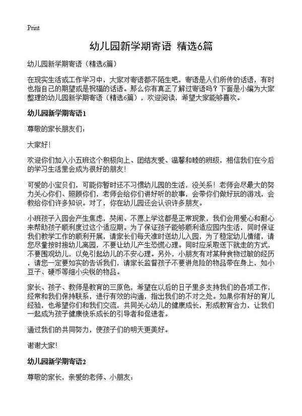 幼儿园新学期寄语6篇 尊敬的家长朋友们:大家好!欢迎你们加入小五班这个积极向上、团结友爱、温馨和睦的班级,相信我们在今后的学习生活里会成为很好的朋友!可爱的小宝贝们,可能你暂时还不习惯幼儿园的生活,没关系!老师会尽最大的努力关心你们、照顾你们,老师会给你们讲好听的故事,会带你们做好玩的游戏,会教给你们许多知识。对了,你在幼儿园还会认识许多朋友。小班孩子入园会产生焦虑,哭闹、不愿上学这都是正常现象,我们会用爱心和耐心来帮助孩子顺利度过这个适应期。为了保证孩子能够顺利适应园内生活,同时保证我们教学工作