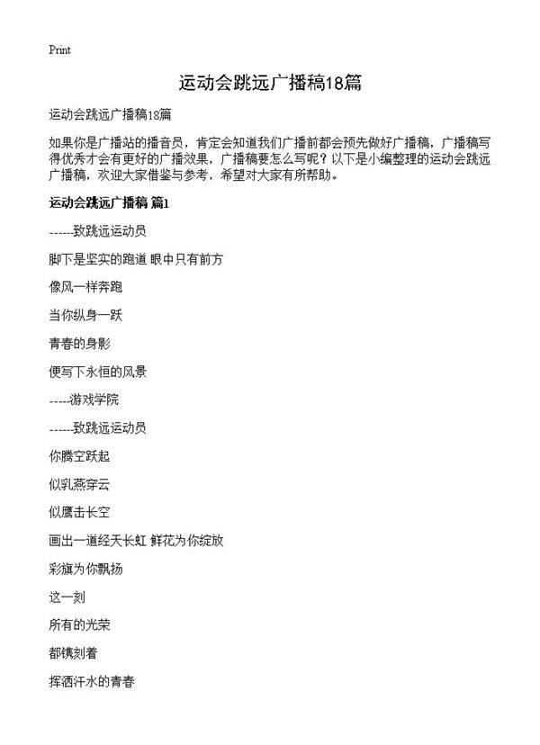 运动会跳远广播稿18篇 跳得更远吧,跨过崭新里程碑——我在这里等你,用我嫩绿诗句,装点你鲜艳胜利!秋风飒爽,含载了多少人期盼与等待。为着能与胜利经历一次美丽邂逅;为着能与冠军经历一回动人相遇;为着,心中梦想——那不熄拼搏之焰:燃烧斗志,铸就辉煌!此刻跳跃或许只是生命短暂一瞬,却如昙花一般绚烂开放,记忆走进青春,常驻!选择跳跃,选择呐喊与欢呼交织舞台,运动律动生生不息;选择跳跃,选择汗水与泪水浇灌沃野,生命绿草丰茂浓密。跳得更远吧,跨过崭新里程碑——我在这里等你,用我嫩绿诗句,装点你鲜艳胜利!跳远,选