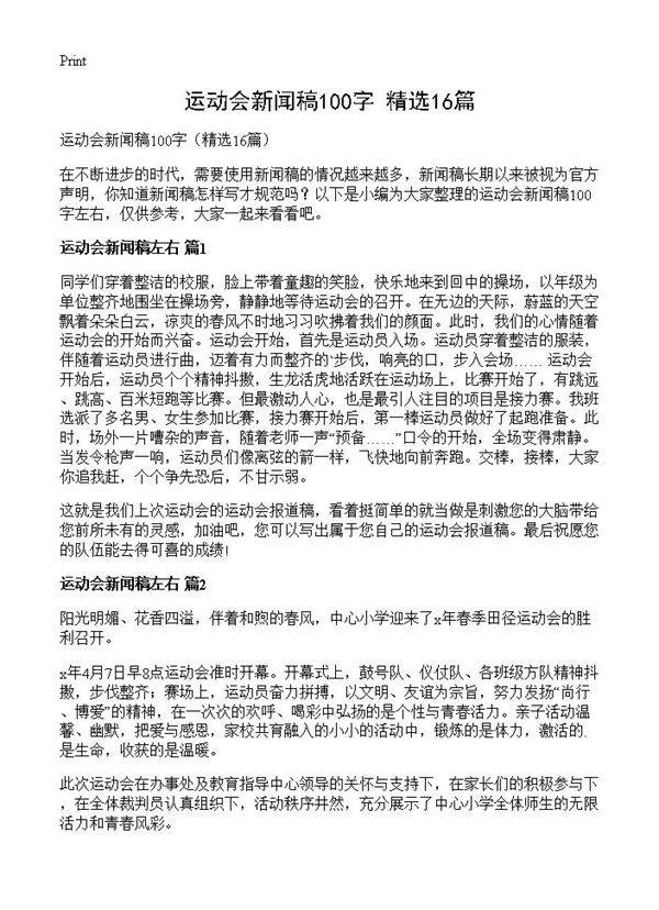 运动会新闻稿100字16篇 在无边的天际,蔚蓝的天空飘着朵朵白云,凉爽的春风不时地习习吹拂着我们的颜面。此时,我们的心情随着运动会的开始而兴奋。运动会开始,首先是运动员入场。运动员穿着整洁的服装,伴随着运动员进行曲,迈着有力而整齐的`步伐,响亮的口,步入会场…… 运动会开始后,运动员个个精神抖擞,生龙活虎地活跃在运动场上,比赛开始了,有跳远、跳高、百米短跑等比赛。但最激动人心,也是最引人注目的项目是接力赛。我班选派了多名男、女生参加比赛,接力赛开始后,第一棒运动员做好了起跑准备。此时,场外一片嘈杂的声音