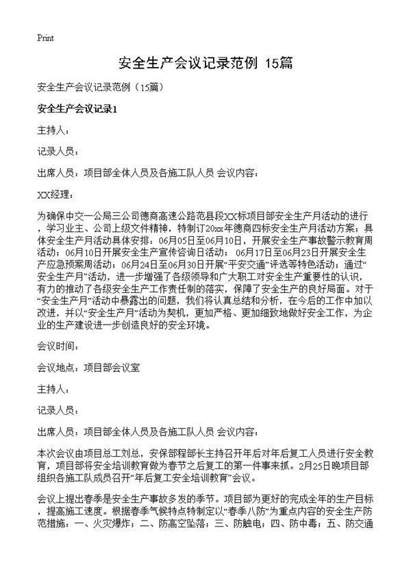 安全生产会议记录范例15篇 会议时间:会议地点:项目部会议室主持人:记录人员:出席人员:项目部全体人员及各施工队人员 会议内容:本次会议由项目总工刘总,安保部程部长主持召开年后对年后复工人员进行安全教育,项目部将安全培训教育做为春节之后复工的第一件事来抓。2月25日晚项目部组织各施工队成员召开“年后复工安全培训教育”会议。会议上提出春季是安全生产事故多发的季节。项目部为更好的完成全年的生产目标,提高施工速度。根据春季气候特点特制定以“春季八防”为重点内容的安全生产防范措施:一、火灾爆炸;二、防高空坠落;