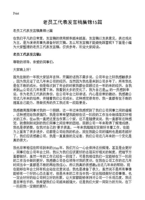 老员工代表发言稿集锦15篇 尊敬的领导,亲爱的同事们:大家晚上好!首先在新的一年祝大家鼠年吉祥,开篇的话我不需多说,公司年会之际我感触很多,因为我见证了这几年来公司的经历,当然因为我也是来到公司多年了,所有我也是在不断的成长,但是每次到了年会的时候我都会回顾过去一年的来的经历,自我来到xx公司这几年积累下来,我看到太多的变化了,我为自己是xx 的一员感到幸运,作为老员工代表的身份,在公司年会之际讲话,内心是非常的激动,我感激公司这几年来的培养,伴随着我们公司成长,这种感觉很奇妙,我一直都有在不断的提高自