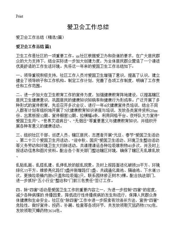 爱卫会工作总结5篇 先将这一年来的爱国卫生工作总结如下:一、领导重视积极支持,社区工作人员对爱国卫生增强了意识,提高了认识,建立健全了领导班子和工作机构。制定工作计划,完善了各项工作制度,明确了工作责任和工作范围。二、进一步加大在卫生教育工作的宣传力度,加强健康教育阵地建设,以提高辖区居民卫生健康意识,巩固居民的健康知识知晓率和健康行为形成率。广泛开展了多种形式的宣传教育,先后召开多次会议、进行一年4次健康宣传员培训,结合不同人群有计划有组织地开展了7次健康教育知识讲座与培训,发放各类宣传资料2