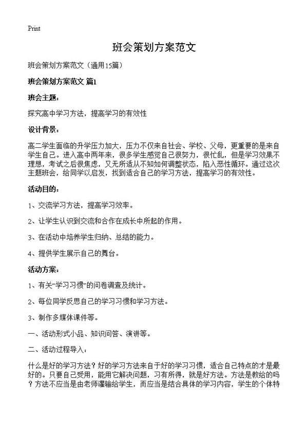 班会策划方案范文15篇 通过这次主题班会,给同学以启发,找到适合自己的学习方法,提高学习的有效性。1、交流学习方法,提高学习效率。2、让学生认识到交流和合作在成长中所起的作用。3、在活动中培养学生归纳、总结的能力。4、提供学生展示自己的舞台。1、有关“学习习惯”的问卷调查及统计。2、每位同学反思自己的学习习惯和学习方法。3、制作多媒体课件等。一、活动形式小品、知识问答、演讲等。二、活动过程导入:什么是好的学习方法?好的学习方法来自于好的学习习惯,适合自己特点的才是最好的。只要自己受用,能用它解决问题