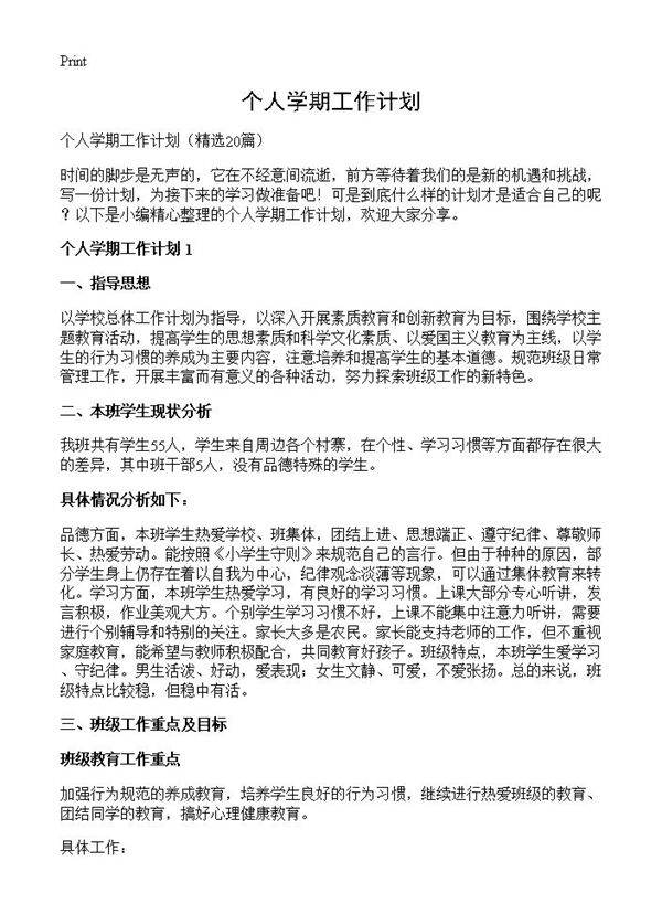 个人学期工作计划20篇 ①认真钻研教材,对教材的基本思想、基本概念,每句话、每个字都弄清楚,了解教材的结构,重点与难点,掌握知识的逻辑,能运用自如,知道应补充哪些资料,怎样才能教好。②了解学生原有的知识技能的质量,他们的兴趣、需要、方法、习惯,学习新知识可能会有哪些困难,采取相应的预防措施。③考虑教法,解决如何把已掌握的教材传授给学生,包括如何组织教材、如何安排每节课的活动。(2)课堂上的情况。组织好课堂教学,关注全体学生,注意信息反馈,调动学生的有意注意,使其保持相对稳定性,同时,激发学生的情感,